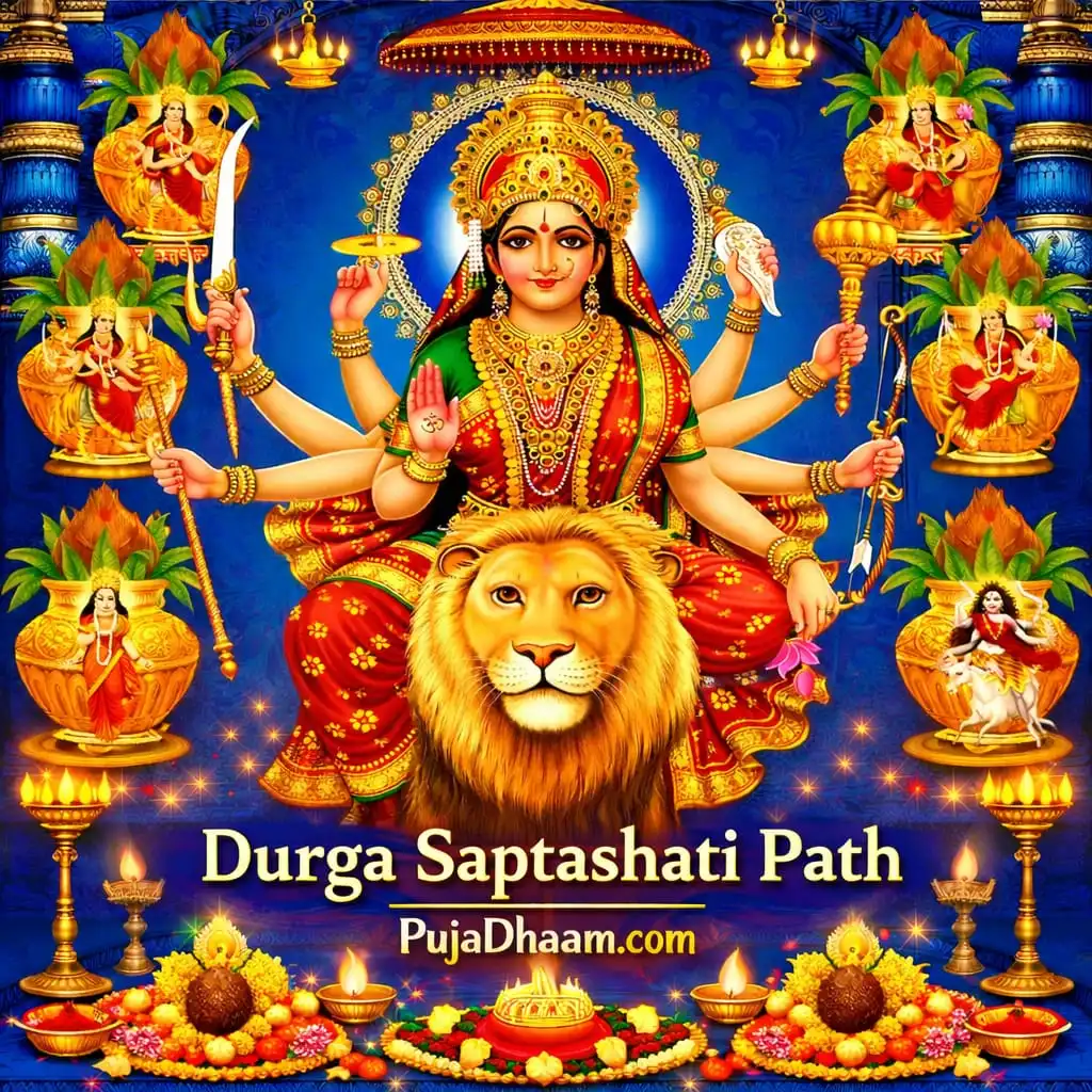 Durga Saptshati Paath (700 shlokas from Markandeya Purana) एक अत्यंत शक्तिशाली Vedic ritual है जो Maa Durga की कृपा प्राप्त करने के लिए किया जाता है। यह Paath तीन भागों में विभाजित है – Prathma Charit, Madhyam Charit और Uttam Charit – जिनमें Maa Durga के विभिन्न रूपों और उनके अद्भुत चमत्कारों का वर्णन है।